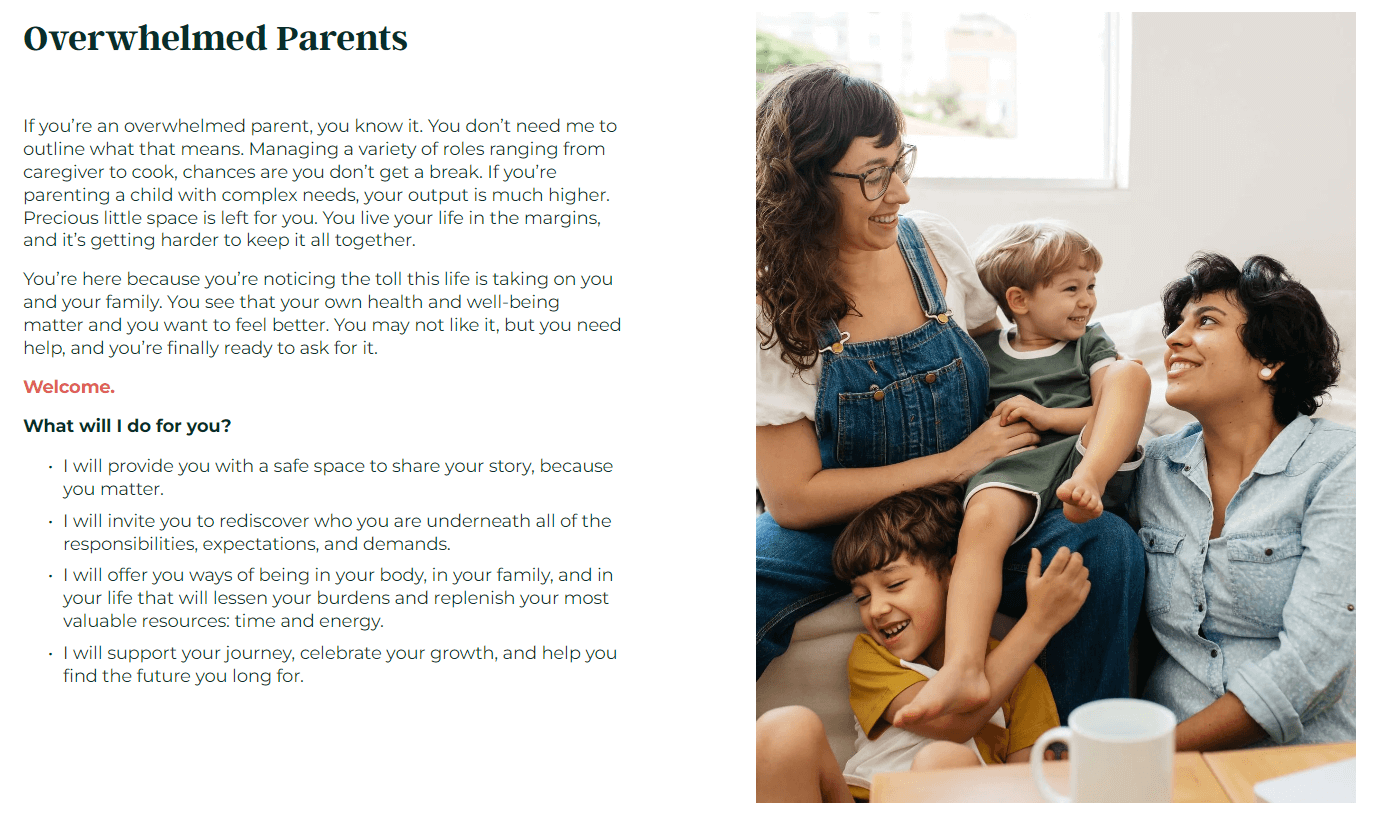 Though Alexis’s private practice had grown steadily, her private practice website had not kept pace. What she needed was a custom therapy website design—one with clean lines, a calming color palette, intuitive navigation, and strong call to action features like Request Appointment buttons—to clearly guide fit clients toward the services they need, whether individual therapy, parent coaching, family counseling, or online therapy.