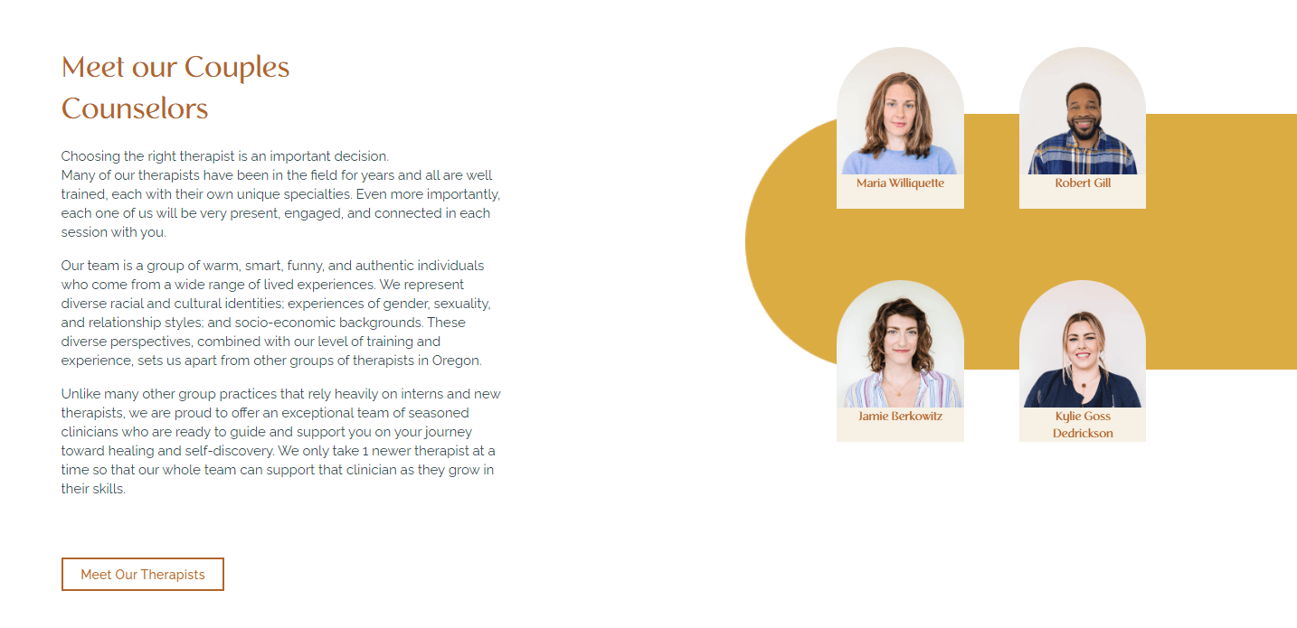 Therapist Bios that Build Trust: Each licensed therapist has a professional bio page designed to communicate credentials, therapeutic approach, and areas of specialty.